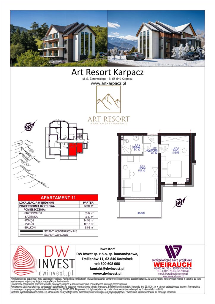 Poniższe zdjęcia przedstawiają przykładowe wizualizacje i standard wykończenia Art Resort Karpacz. Finalny układ, metraż i rozmieszczenie elementów wyposażenia apartamentu mogą się różnić w zależności od wybranego numeru lokalu.